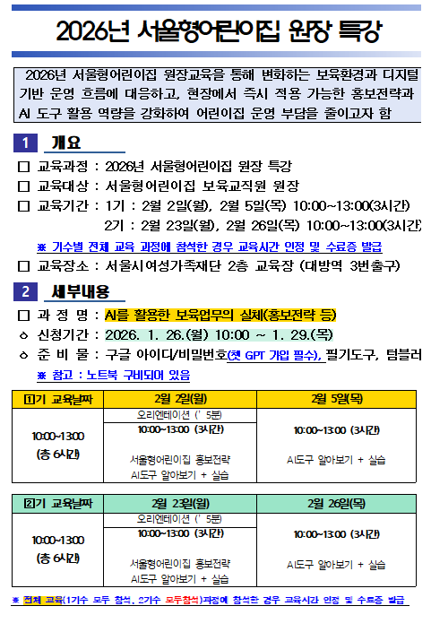 열린공간 공지사항 자료실 FAQ 컨텐츠 내용 시작 HOME 열린공간 공지사항 공지사항 공지사항 상세 화면 페이지 고정여부 작성자 관리자 제목 2026년 서울형어린이집 원장 특강 안내 등록일 2026-01-23 첨부파일 첨부파일 * 서울형 교육시간 인정 가능합니다.* 주차비 개인 부담입니다. 확인