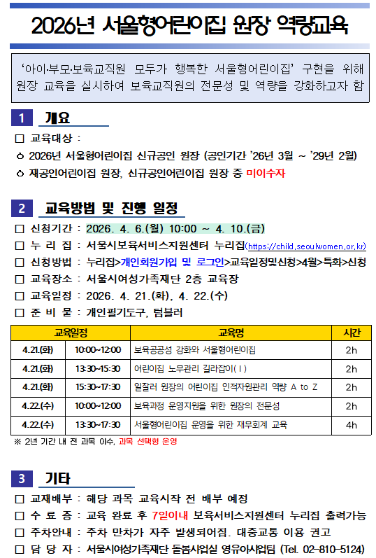 열린공간 공지사항 자료실 FAQ 컨텐츠 내용 시작 HOME 열린공간 공지사항 공지사항 공지사항 상세 화면 페이지 고정여부 작성자 관리자 제목 2025년 서울형어린이집 보육교직원(원장) 전문성 및 역량강화 교육안내 등록일 2026-03-30 첨부파일 첨부파일 2600421_서울형교육 안내자료.hwp [229888 byte] 확인